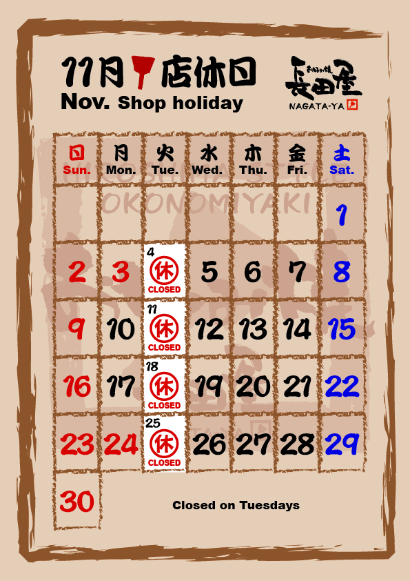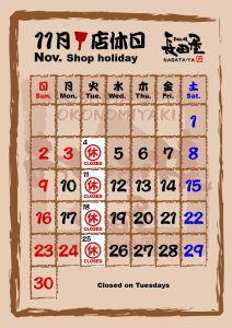 We will be closed on Tuesdays in November.