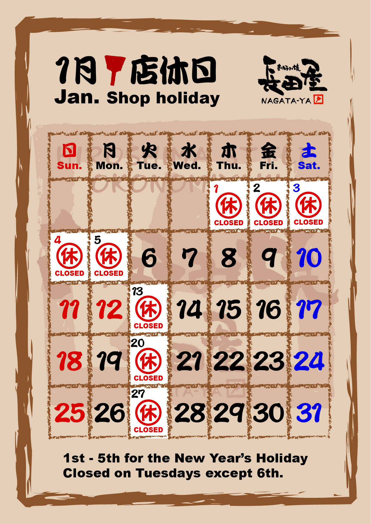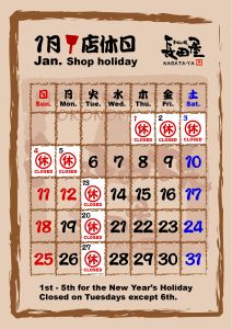 1/1~1/5までお正月休暇を頂き、年始は1/6(火)より通常営業となります。 以降は毎週火曜日が店休日となりますのでよろしくお願いいたします。